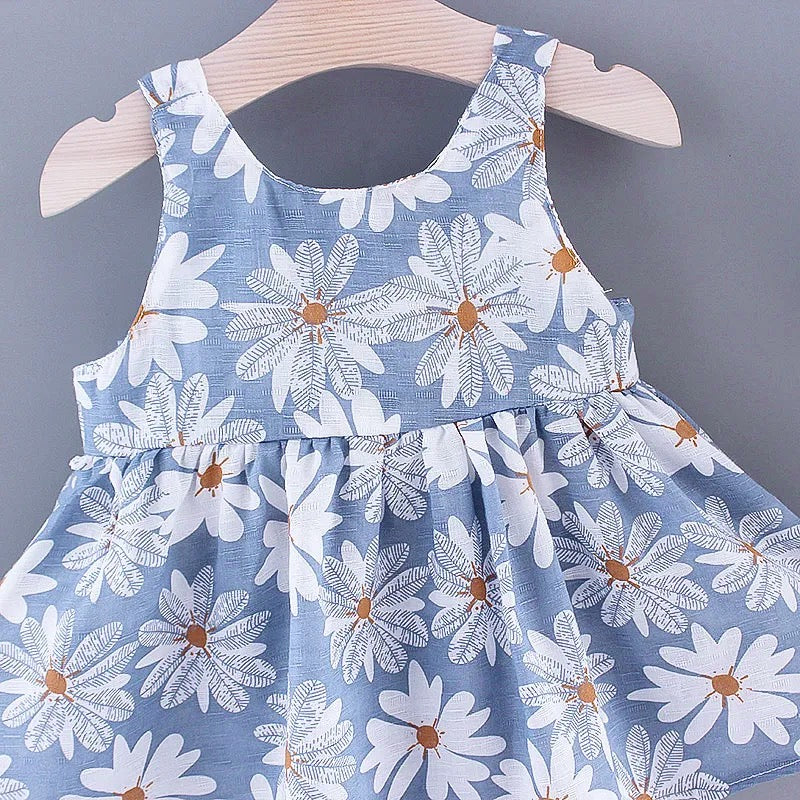 Impress your little one with this cute and comfortable baby girl all-over daisy floral print bowknot sleeveless tank dress with hat set, perfect for any summer day out.
