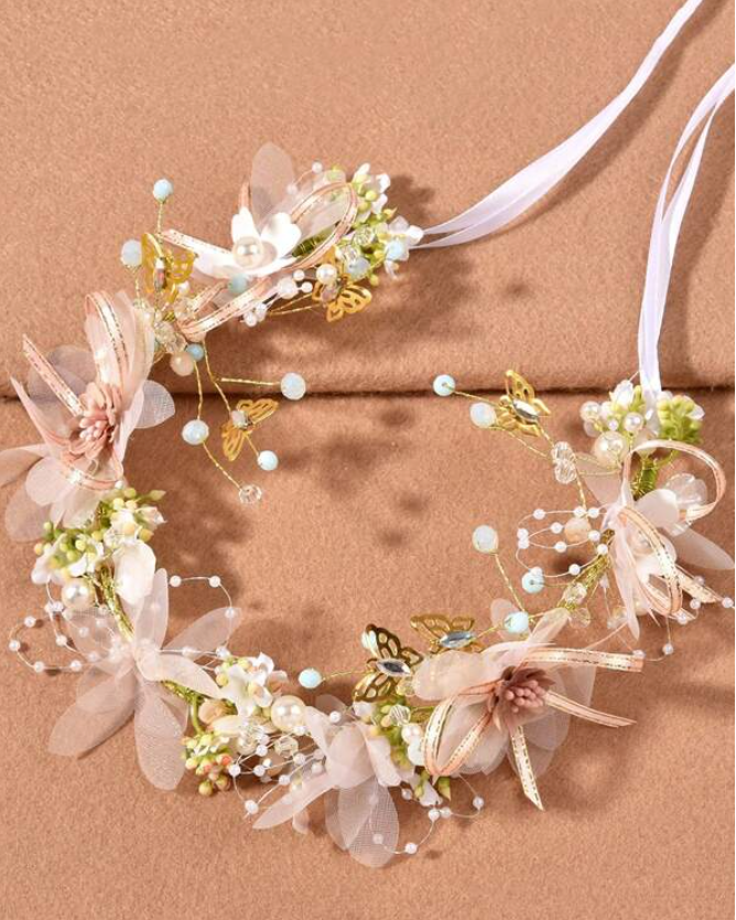 The headdress is made of soft tulle in the shape of a flower, with pink bows made of ribbons and fabric flowers on it, and a bright spot is designed on it - a 3D three-dimensional golden butterfly, inlaid with a white diamond crystal and The light blue crystal stone, surrounded by handmade plants, is very cute, elegant, and instantly shines, making you charming little girl.